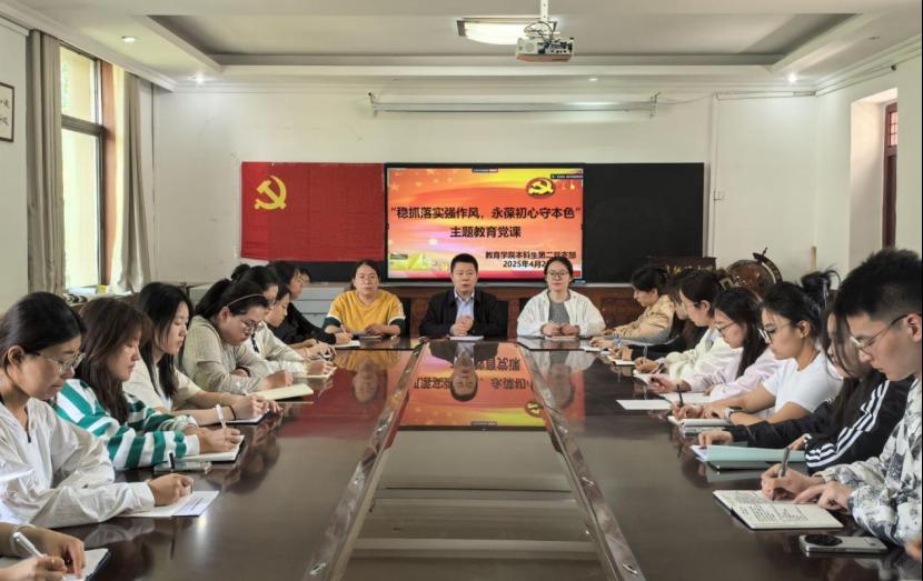 大乐透 讯(通讯员:常耀文)为深入学习贯彻习近平新时代中国特色社会主义思想,扎实推进深入贯彻中央八项规定精神学习教育,加强党的作风建设,4月23日,大乐透 本科生第二党支部书记张东霞于学院305会议室为支部党员讲授“稳抓落实强作风,永葆初心守本色”主题教育党课。