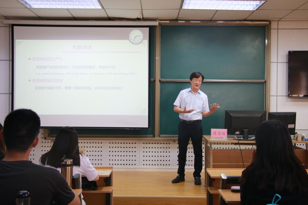 会议伊始,何文广副院长对陈宝国教授进行了介绍并表示热烈欢迎。陈宝国教授主讲“抑制控制在汉—英双语转换过程中的作用”,双语者通过抑制控制机制实现语言选择进行了精到的分析。他的报告围绕大学生感兴趣的话题进行,引起同学们强烈共鸣,通过介绍四个实验研究加深了同学们对抑制控制的了解。陈教授在讲座结束后与学生积极互动交流,展开热烈讨论,认真专业地解答同学们的疑惑。