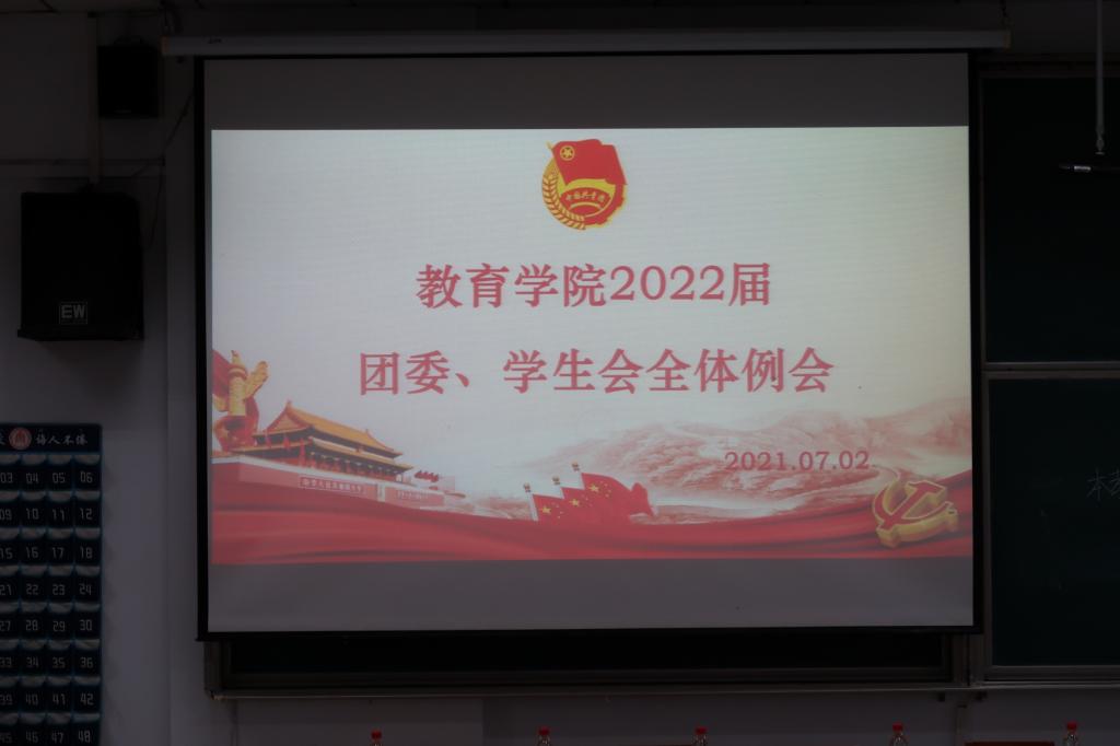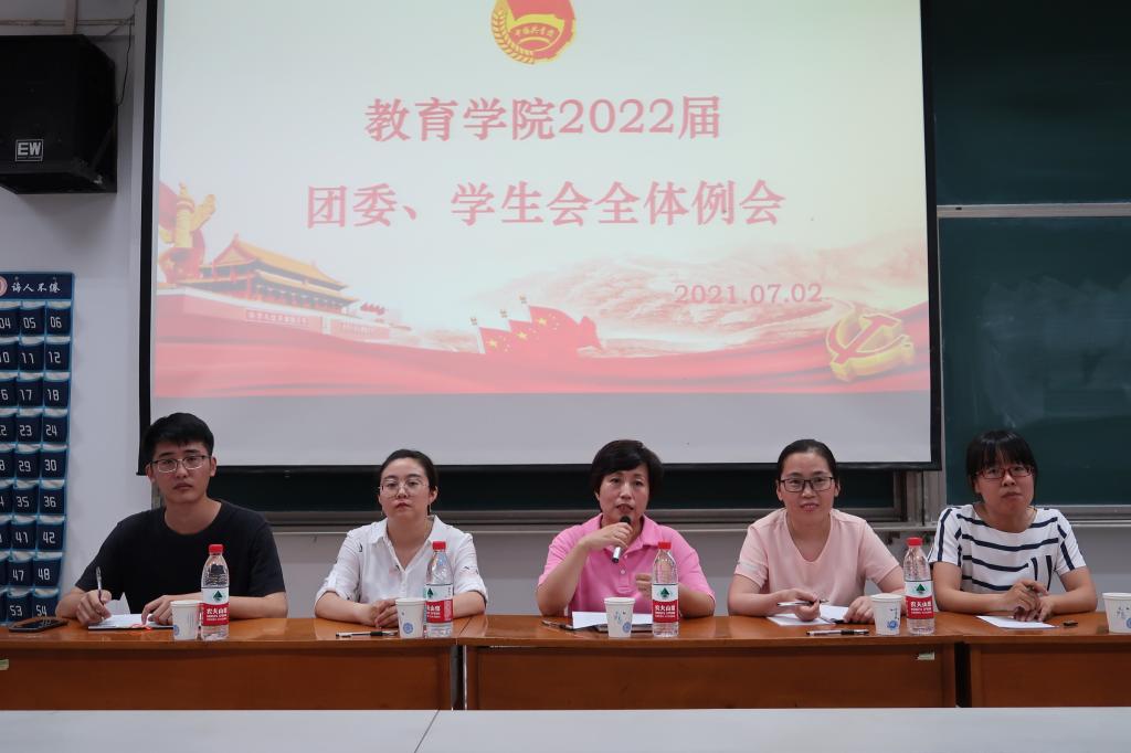 7月2日晚,大乐透 2022届团委、学生会全体例会在综合楼606教室顺利召开。出席本次会议的老师有团委书记周长缨、2018级辅导员王保英、2020级辅导员侯萍萍和曹亚楠。会议由学生会主席庞霄汉主持。