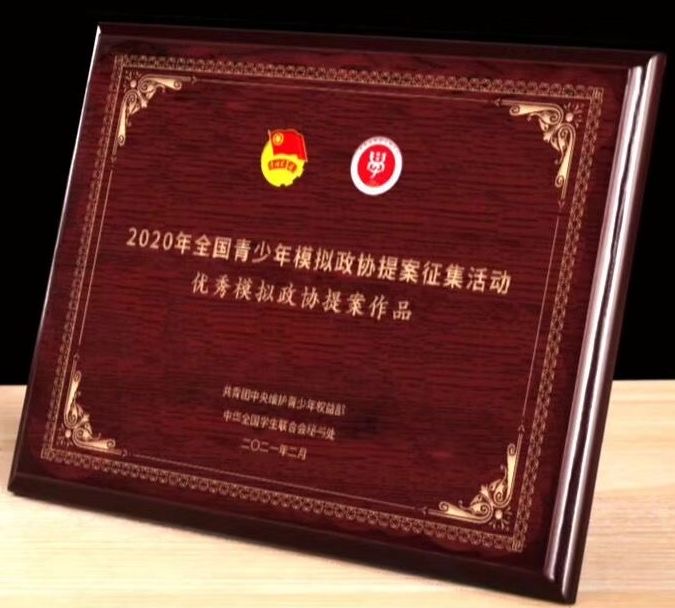 民主政治接班人团队在2020年全国青少年模拟政协提案征集活动中,荣获大学组“优秀模拟提案作品”荣誉称号。
