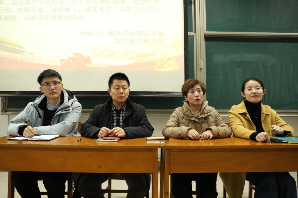 首先,院学生会主席庞霄汉对本学期学生会工作进行总结,并对后续工作作具体安排;随后,周长缨、张东霞老师分别讲话,她们在讲话中指出,学生干部要严以律己,明确自身的义务和责任,积极备考,诚信考试,充分发挥模范带头作用;接着,院学生会秘书处副秘书长王芸霄带领学生会全体成员宣读诚信应考承诺书;最后,孙书记作总结讲话。他对院团委、学生会一学期以来的工作表示肯定,对学团老师和同学们的辛勤付出表示感谢,同时强调,全体学生干部要提高认识,认真复习备考,带头遵守考试纪律,争作诚信守纪的表率,树立好大乐透