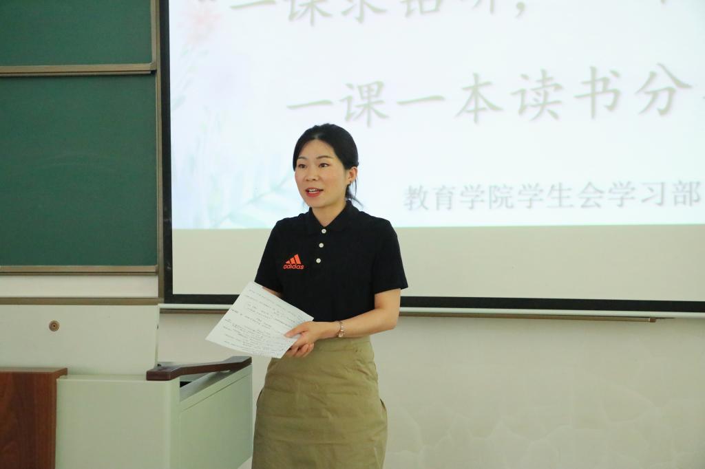徐瑞老师在讲话中指出,学院的读书分享汇活动是必要且有效的,希望同学们能树立终身学习意识、培养终身学习能力、实现终身受教育,通过学一门课读一本书,学原文读原著悟原理,为未来的人生发展打下良好基础。