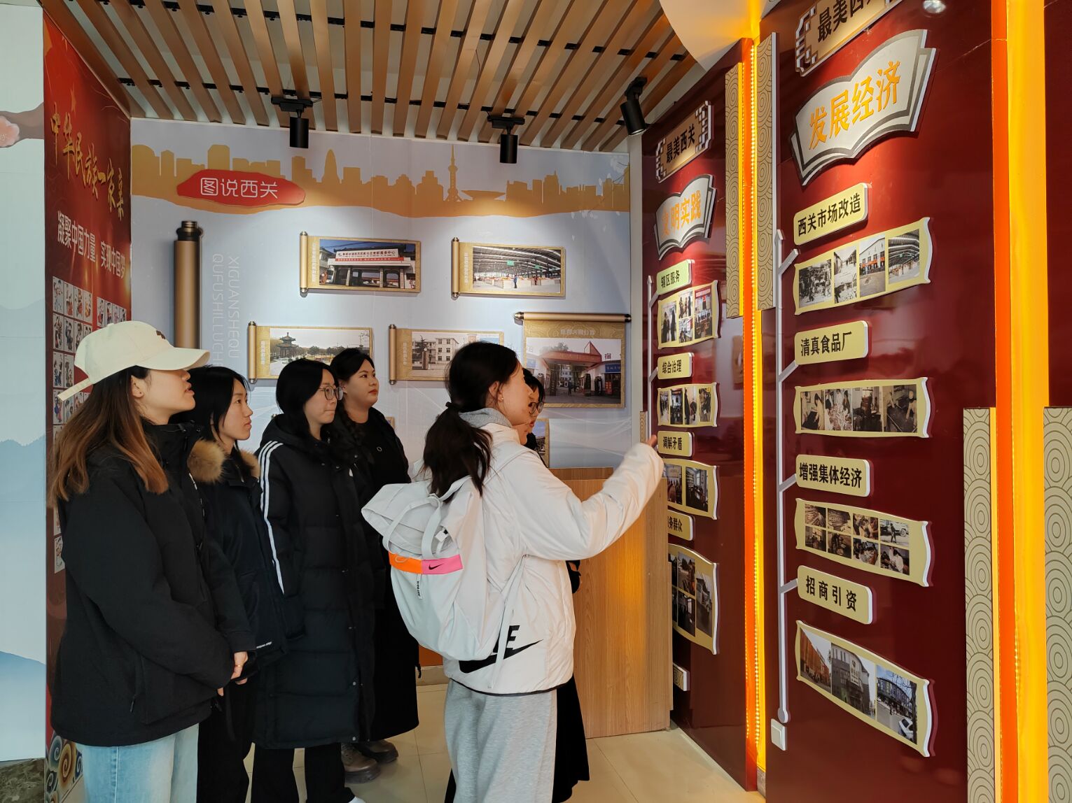 另一部分志愿者在社区工作人员的引领下开启社区参观学习之旅。为优化社区儿童社交课程设计,他们与社区工作者展开深入交流,重点请教关于社区儿童成长以及社交环境构建方面的独到见解,从基层社区工作的视角汲取经验智慧,为党建引领下的儿童教育工作夯实基础。随后,他们来到社区的红石榴驿站、西关民族社区展览馆等多个特色文化展点进行参观学习。讲解员生动地讲述了西关社区的发展历程和代代相传的红色故事,这些故事彰显出西关社区在党建引领下建设发展的光辉印记。同学们深刻感悟到党建引领和中华民族共同体意识如何在西关社区生根发芽,孕育出独特而浓郁的文化氛围,也更加坚定了在今后学习与实践中传承红色基因、服务社区发展的信念与决心。