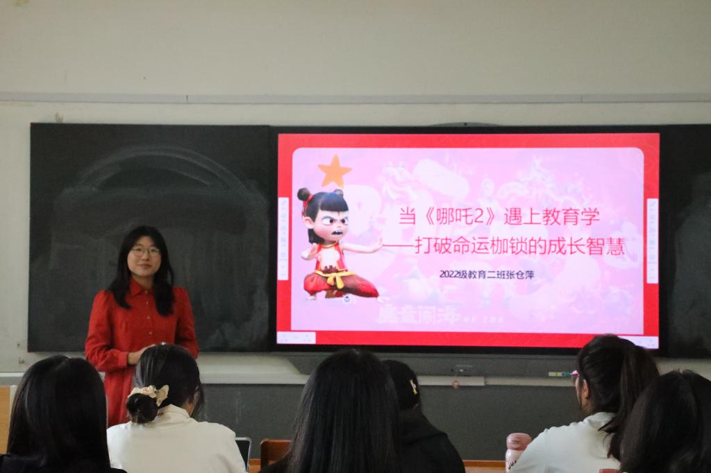 张仓萍以当下热门动画电影《哪吒之魔童闹海》为典型示例,分析影片主人公哪吒在成长历程中面临的困境挑战及自我突破蜕变的情节。基于此,她引导同学们围绕教育学领域中个体成长智慧这一议题展开深入研讨,助力师范生从教育视角探究个体发展的本质规律,为理解教育场景中个体的成长规律提供多样化视角。
