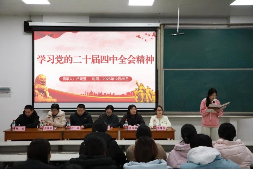 会上,学院团委组织部副部长卢晓萱领学《中国共产党第二十届中央委员会第四次全体会议公报》,引导学生干部深刻领会党的二十届四中全会精神的核心要义,明确新时代青年学生干部的使命担当,鼓励大家将理论学习成果转化为服务同学、推动学院工作的实际行动。