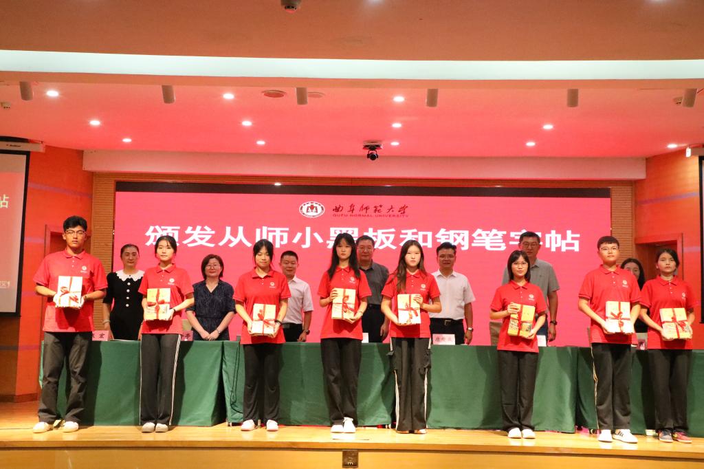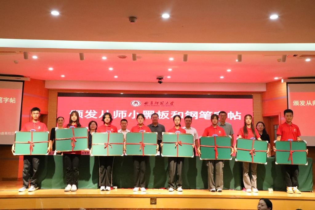 随后,领导老师们为2024级新生代表颁发从师小黑板和钢笔字帖,并希望同学们能够领会学院的良苦用心,充分用好每一块黑板、每一页字帖,勤奋练习,用心书写大乐透 师范教育品牌新篇章,以实际行动践行对优秀书写的追求,努力提升自身素养,为青春添彩,为未来筑基,充分展现新时代师范生的风采与担当。