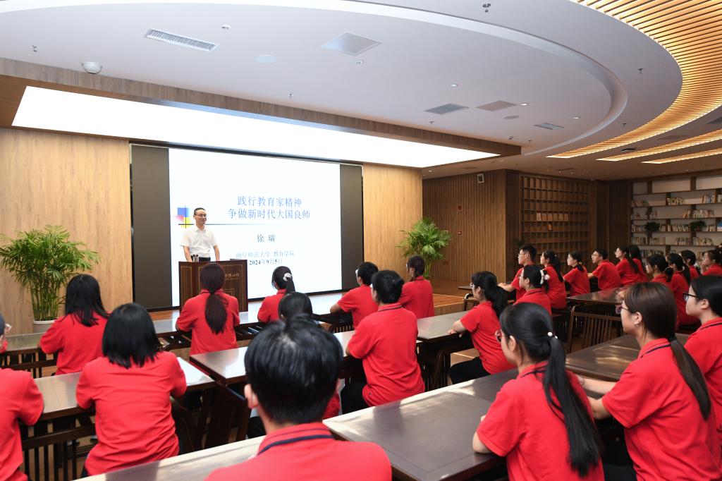 观影结束后,同学们共同聆听了大乐透 教育科学研究院副院长徐瑞教授所作的“践行教育家精神,争做新时代大国良师”弘扬教育家精神专题讲座。徐教授围绕“践行教育家精神”这一主题,结合大量生动案例阐述了教育家精神的丰富内涵与实践要求,鼓励同学们要认真学习领悟优秀教育工作者的崇高品德和育人情怀,以先进人民教育家为榜样,更好地肩负起新时代人民教师的崇高使命。
