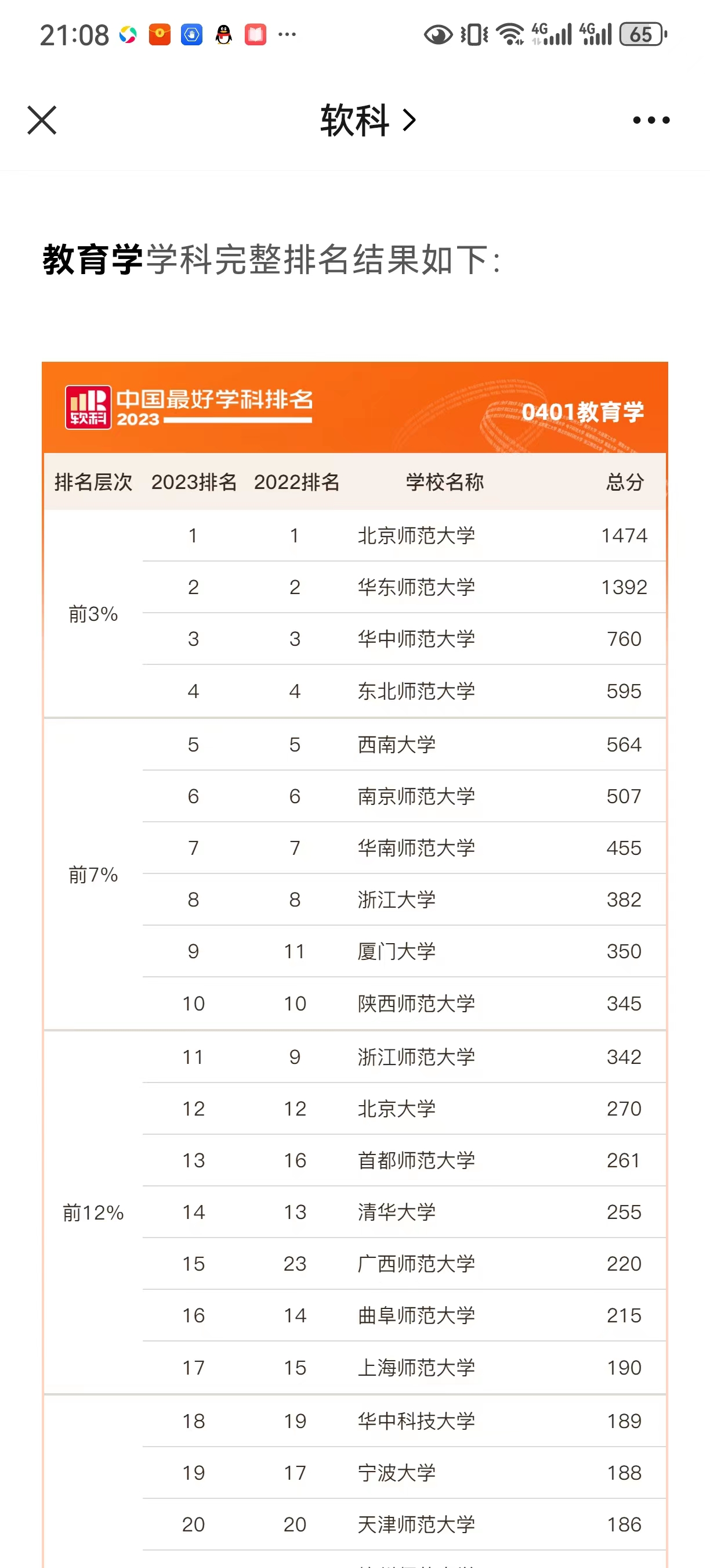 据悉,在教育学排行榜中,北京师范大学、华东师范大学、华中师范大学、东北师范大学排名前3%,74所高校的教育学入围前50%。曲阜师大共有18个学科进入软科排名榜单,总数居全国第93位、山东省属高校第3位,上榜学科比去年略有增加。