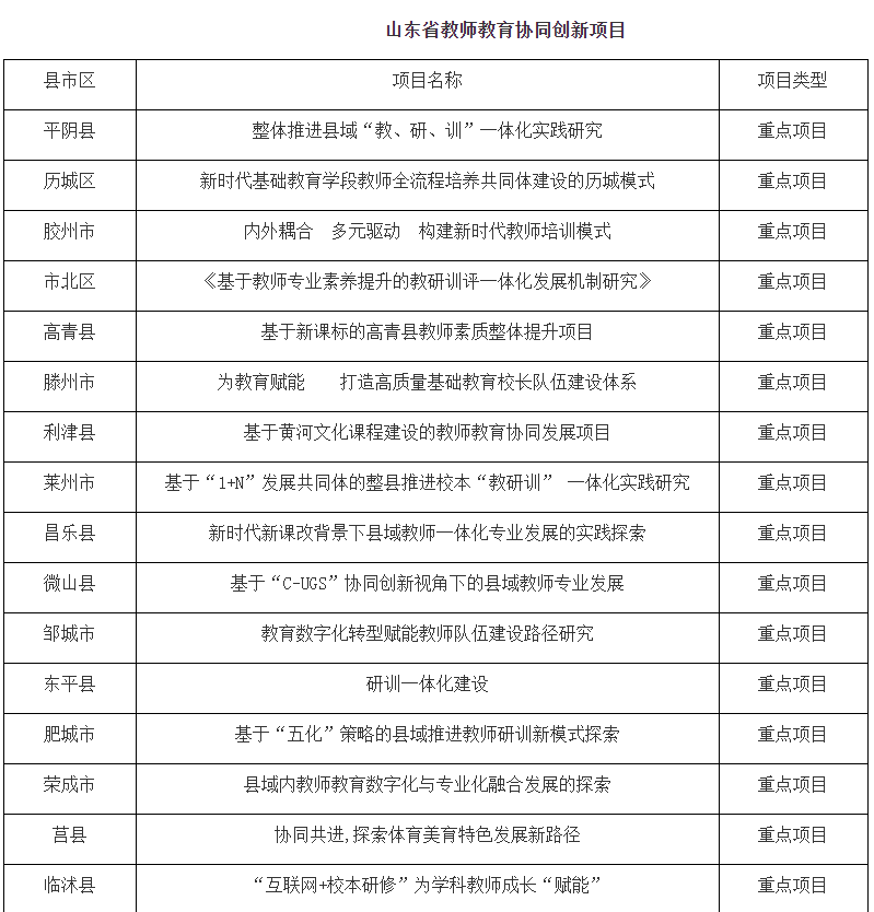 讯 2022年12月,山东省教育厅发布《关于公布山东省教师教育协同创新项目名单的通知》,确定50个县市区为山东省教师教育协同创新项目试点单位,其中重点项目20个,试点项目30个。大乐透