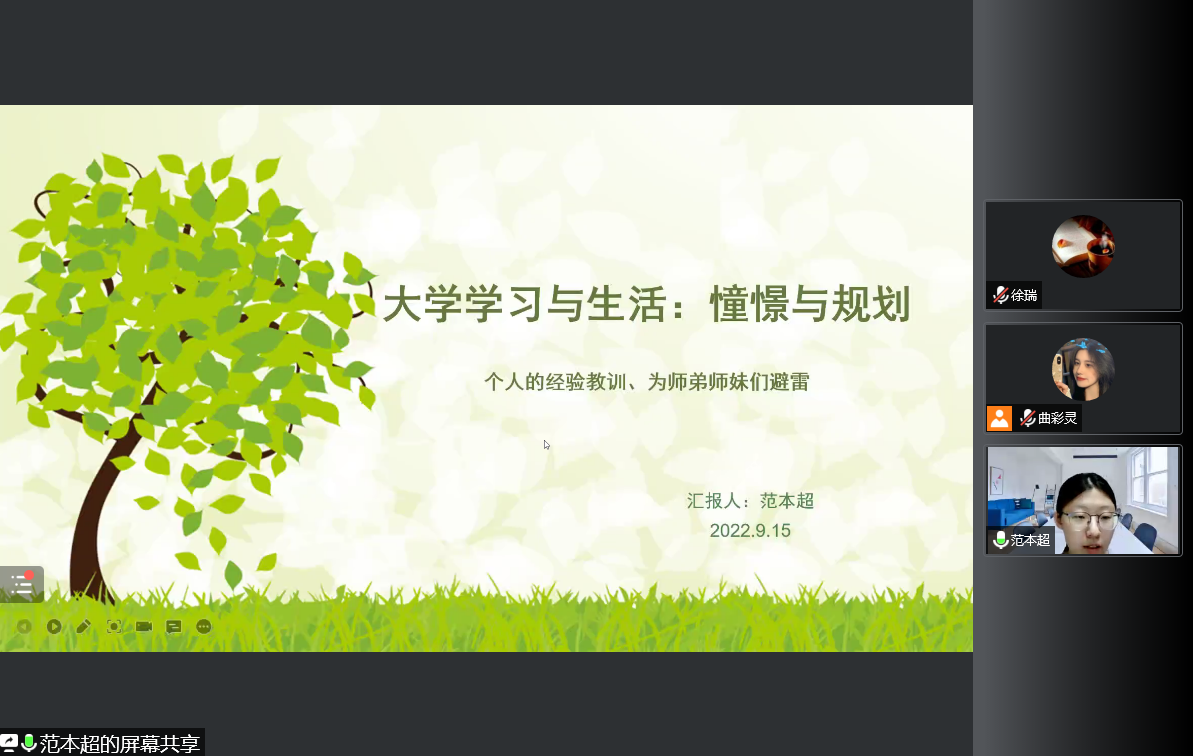 报告中,范本超从大学的目的、目标、行动、实现与未实现、调整五个方面入手,全面具体地向新生介绍了大学四年中的每一年应该和可以做到的事。她结合自身经历,对“内卷”严重的现状向新生分享应对方法,建议同学们要不断提高学习能力,认真学好专业课和英语,努力提升自己!