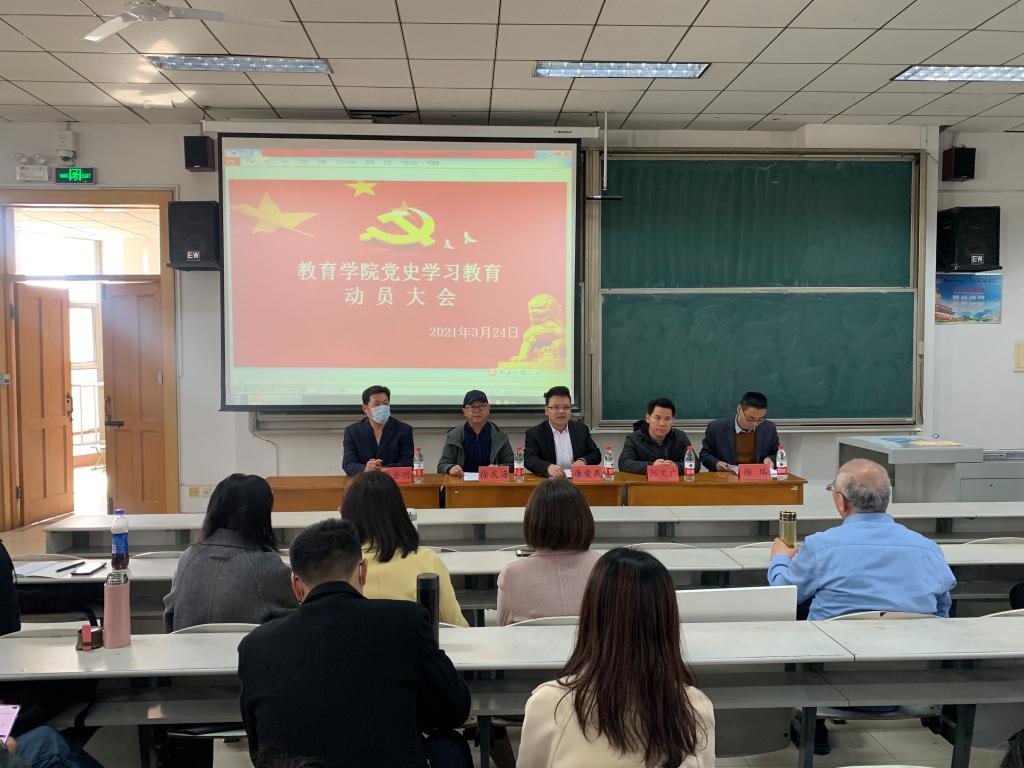 在综合教学楼301室召开党史学习教育动员大会,深入学习贯彻习近平总书记在党史学习教育动员大会上的重要讲话精神和学校党委书记戚万学在学校党史学习教育动员大会上的讲话精神,紧密结合学院发展实际,对学院高质量高标准开展党史学习教育进行动员部署。