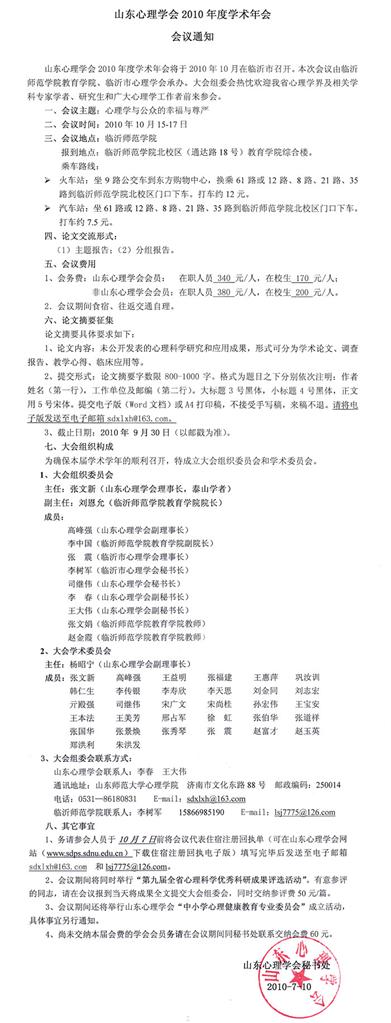 山东心理学会2010年度学术年会会议通知