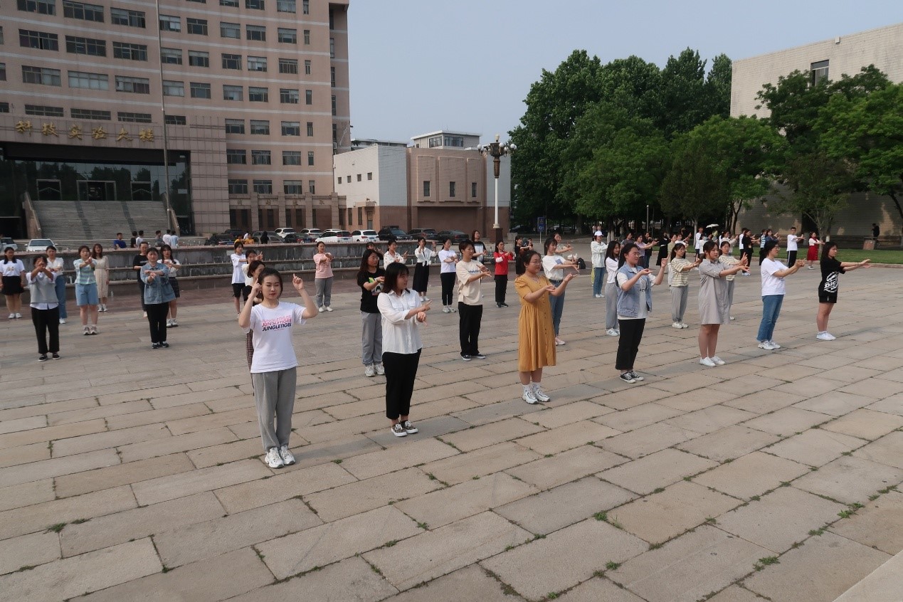 活动开始后,首先由领舞人员进行现场教学,参与人员分成五组,每个小组有一名领舞人员进行舞蹈动作的教学,各小组同时进行舞蹈学习和排练。伴随着轻快又富有节奏的音乐,在领舞人员的带领下,同学们积极认真地练习,整个排练过程洋溢着欢乐的气氛。学习结束后全体同学进行汇报表演,在轻松欢快的音乐旋律中,同学们动作舒展自如,舞蹈动作多样,队伍变化有序,充分展示了大学生的朝气蓬勃,积极向上的良好面貌。