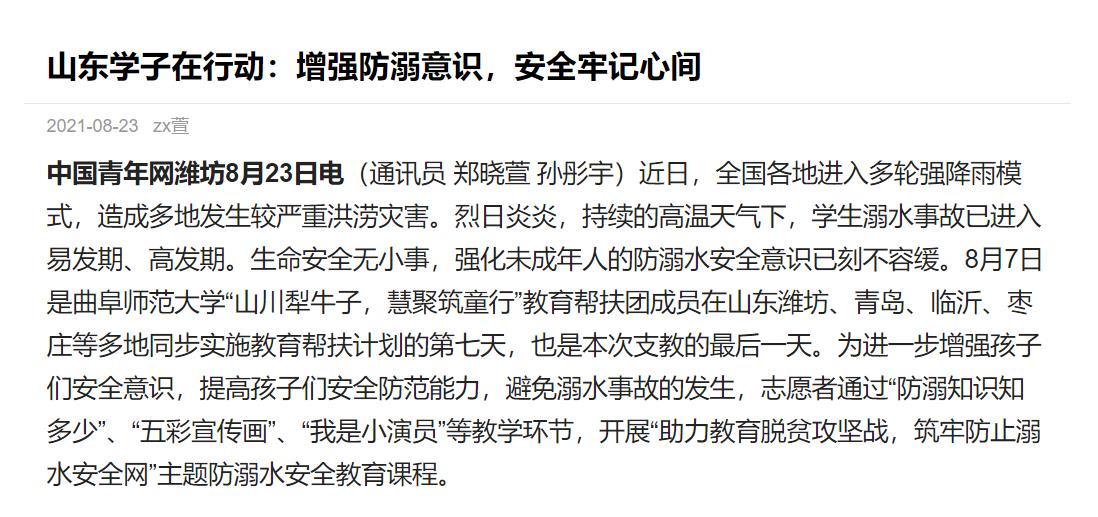 中青网:山东学子在行动:增强防溺意识,安全牢记心间