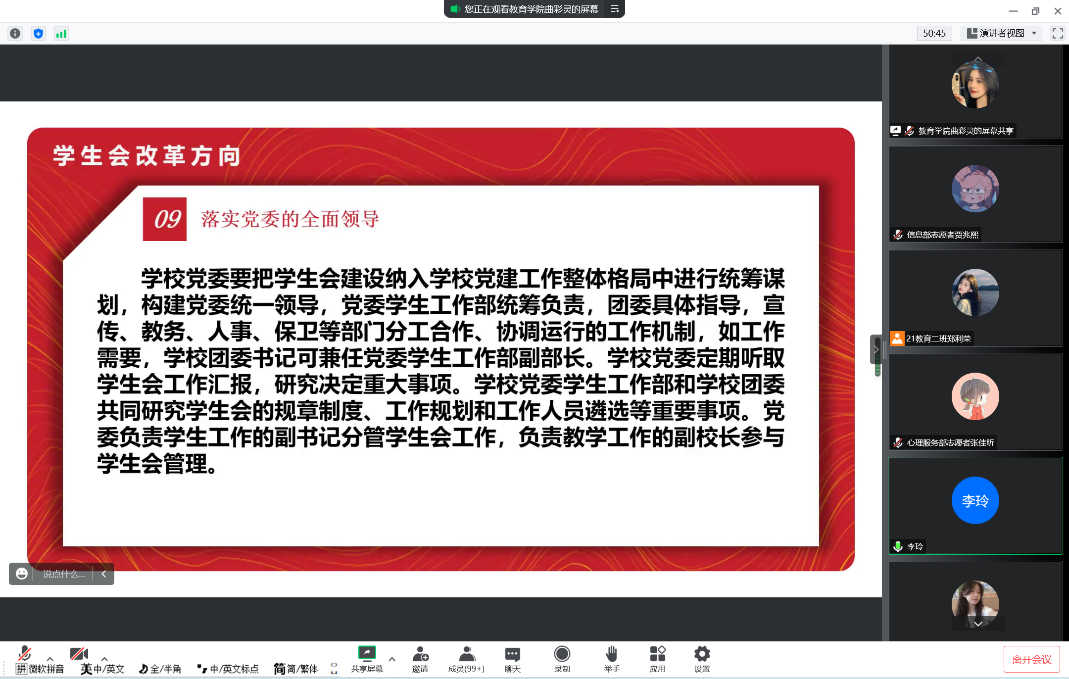 李玲以“学生会改革要求及学生干部价值追求”为题,从学生会改革方向以及学生骨干的自我定位两方面对学生干部进行思想教育。随后,她从明确职能定位、坚持精简原则、坚持从严治会等十个方向对学生会改革提出明确要求,并阐释了学生会改革的原因及其意义。同时,李玲老师也从恪守学生本分、牢记服务宗旨、永葆理想情怀三方面指导学生骨干明确自我定位,并希望大乐透