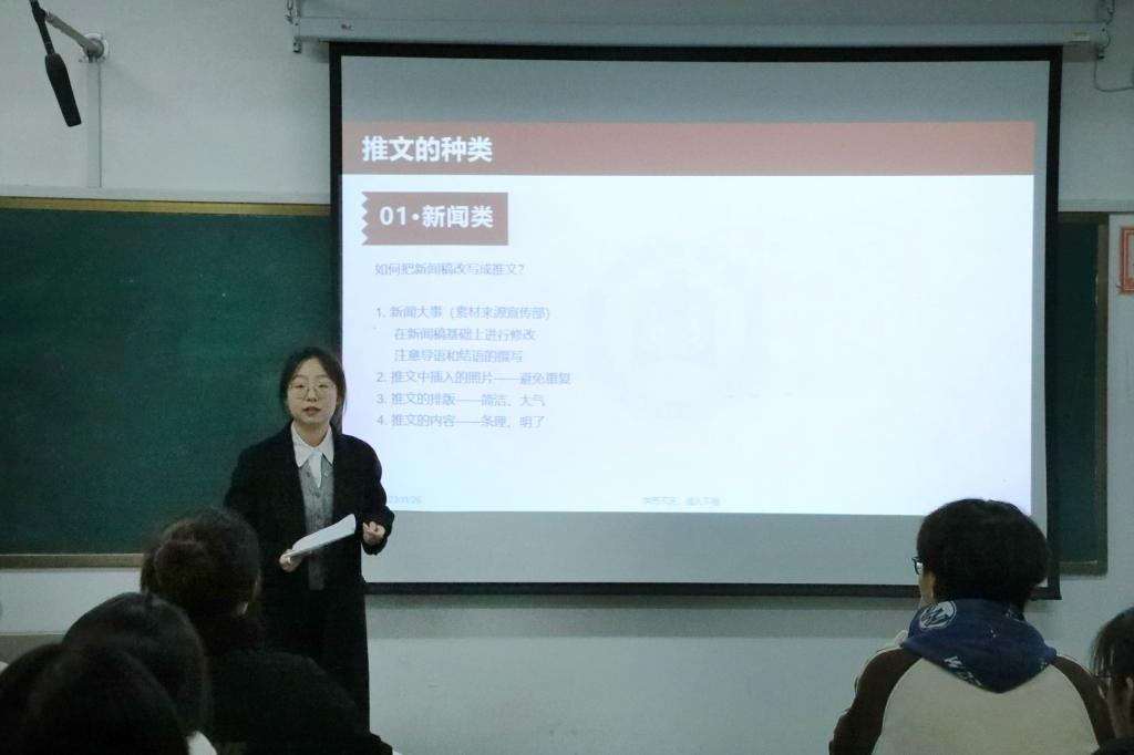 焦子琰以“互联网时代下的双翼飞翔”为主题,从新媒体运营与策划和大学生网络文化素养两个方面开讲。她强调要把创新精神融入新媒体运营,在学习借鉴其他院校优秀经验的同时积极探索自身独特的运营方式,鼓励大家积极发表自己的想法,为学院官网和微信、抖音公众号的更好运营共同努力。此外,她还从网络安全、隐私保护和言论发表等方面阐述了网络文化对大学生的影响,并提醒同学们要努力培养明辨是非的能力。