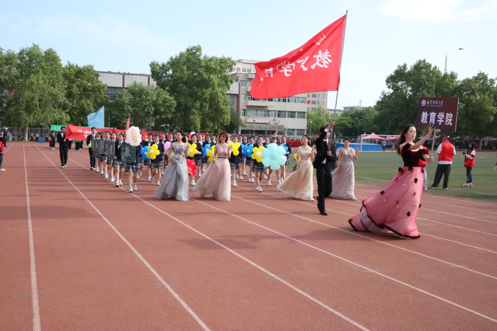 运动员方阵入场,教院学子身着统一服饰,手持色彩缤纷的气球,以朝气蓬勃的姿态向主席台走去。“扬帆把舵,奋力拼搏,教院学子,气势磅礴”的口号展现了大乐透 青年学子昂扬向上的精神面貌与青春的活力。