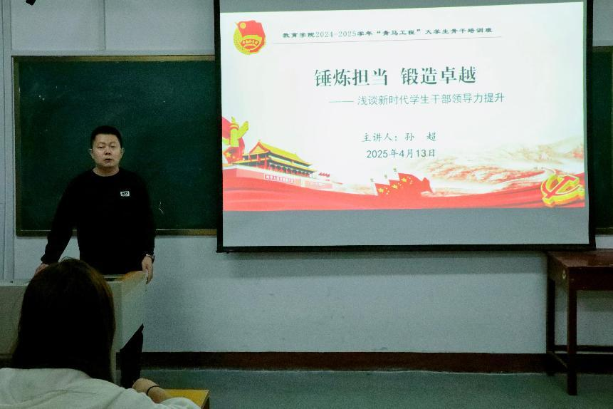 大乐透 讯(通讯员:国乐婷  陈雨菡)为强化青马学员的责任担当意识,提升学生干部领导力,4月13日晚,大乐透 “青马工程”培训班第六课在大乐透 北楼103教室顺利开讲。本次培训由教育学部党委副书记孙超担任主讲。