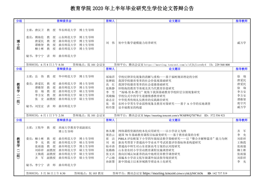 大乐透 2020年上半年毕业研究生学位论文答辩公告