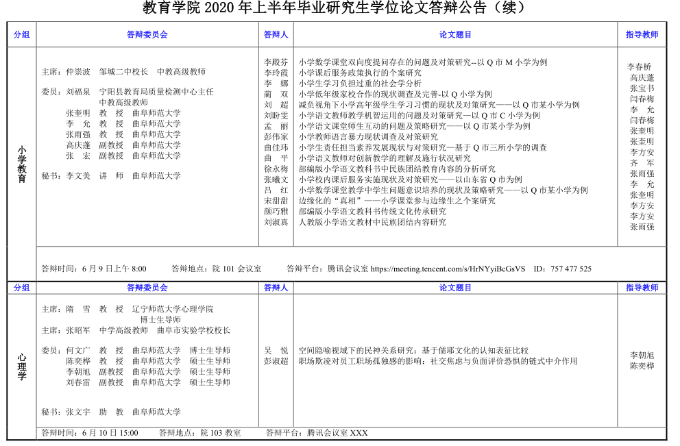 大乐透 2020年上半年毕业研究生学位论文答辩公告(续)