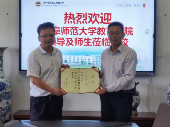 唐爱民院长表示,希望通过本次实习,能让实习教师充分认识教育工作的意义,真正体会到当一名人民教师的高尚和光荣,期待实习教师能圆满完成实习任务,早日成为合格的人民教师!唐院长还亲自为孔子学堂题字并为苏明校长颁发兼职教授聘书。
