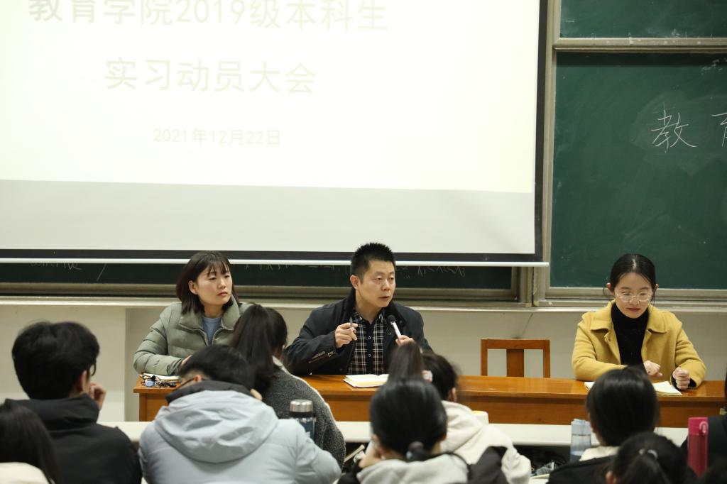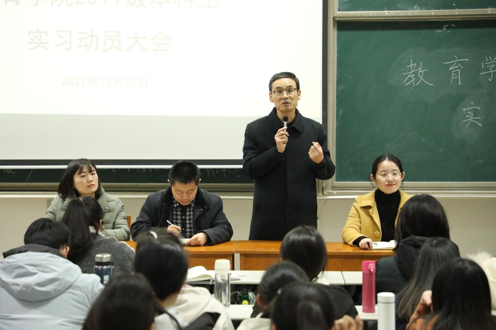 会上,分管教学工作的副院长徐瑞教授从实习的价值与意义、实习方式、实习要求、注意事项等四个方面全面介绍了下学期教育实习的相关问题。他强调,同学们要以“不卑不亢”的态度对待本次实习,虚心向指导教师和周围的同事学习,理论和实践相结合,通过教育实习全面提升个人专业素养。