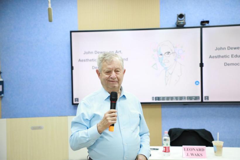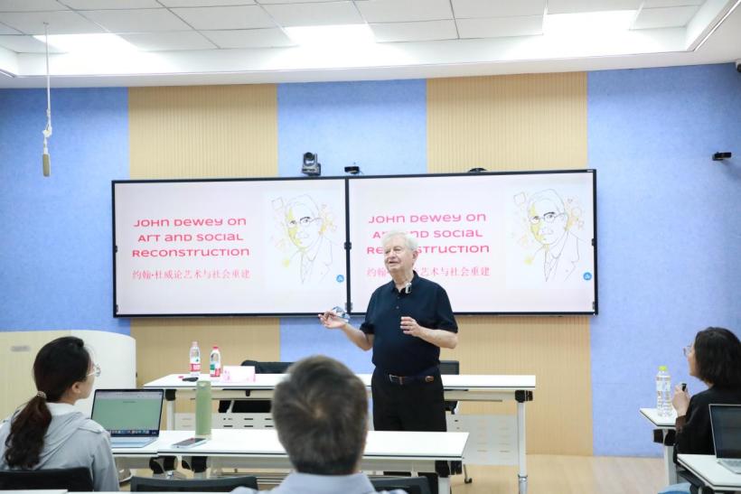 6月19日的讲座围绕杜威艺术教育理论展开。Waks教授深入阐释了“艺术即经验”的核心命题,指出艺术是运用物质材料创造可感知事物的过程,艺术创作是“做”与“受”的辩证统一过程。在艺术教育与审美教育方面,杜威指出,教育中存在学科内容与经验脱节和学校与生活脱节的弊端,主张围绕有目的的活动组织学习,让学生贴近现实问题、解决现实问题。同时,他特别分析了审美体验的民主价值,认为艺术能打破社会偏见,促进跨群体理解,这一观点引发了在场师生的热烈讨论。
