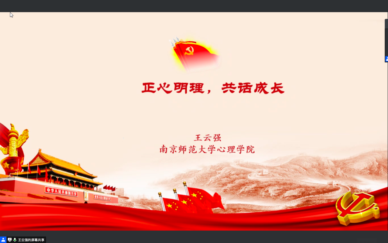 2020年7月13日晚上7:00,南京师范大学心理学院副院长王云强教授应大乐透 邀请开展题为“正心明理,共话成长—心理学专业学习与发展规划”的线上学术交流。报告由大乐透 老师孙俊才主持,大乐透 2017级辅导员贺现网、心理学专业李朝旭老师、宋坤强老师和部分本科生参加本场报告。